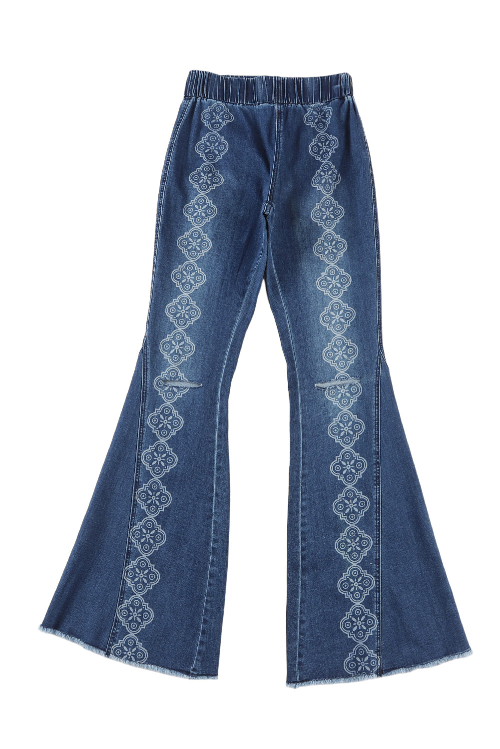 Présentation de notre jean bleu effet vieilli à ourlet brut et bas cloche. Ce jean graphique pour femme présente un motif imprimé laser unique qui ajoute une touche de nervosité à votre look. Fabriqués à partir de denim de haute qualité, ces jeans sont non seulement élégants mais également durables. Améliorez votre jeu de style avec ce jean unique en son genre.