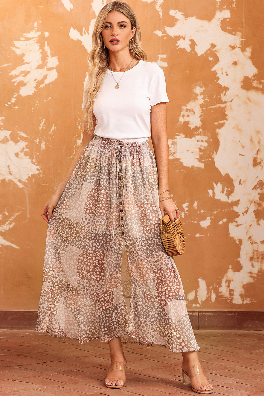 Jupe bohème à imprimé floral en tissu crêpe - confortable et élégante. Taille smockée pour une coupe flatteuse, bouton sur le devant et fente pour faciliter les mouvements. Parfait pour toutes les occasions.