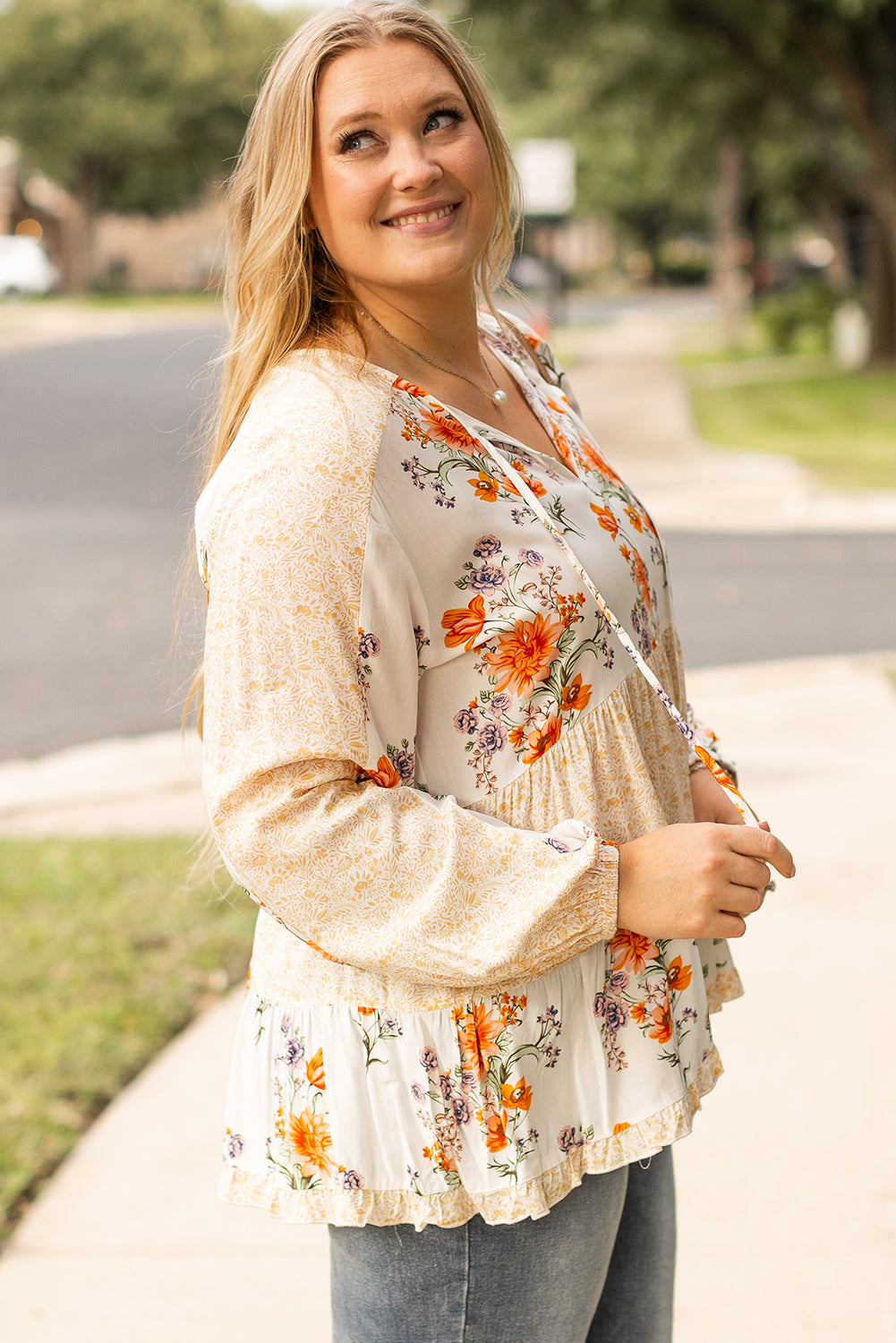 Blouse fleurie grande taille avec coupe ajustée et manches bouffantes tendance. Détail cravate au cou pour un style sophistiqué. Un ajout abordable et polyvalent à votre garde-robe.