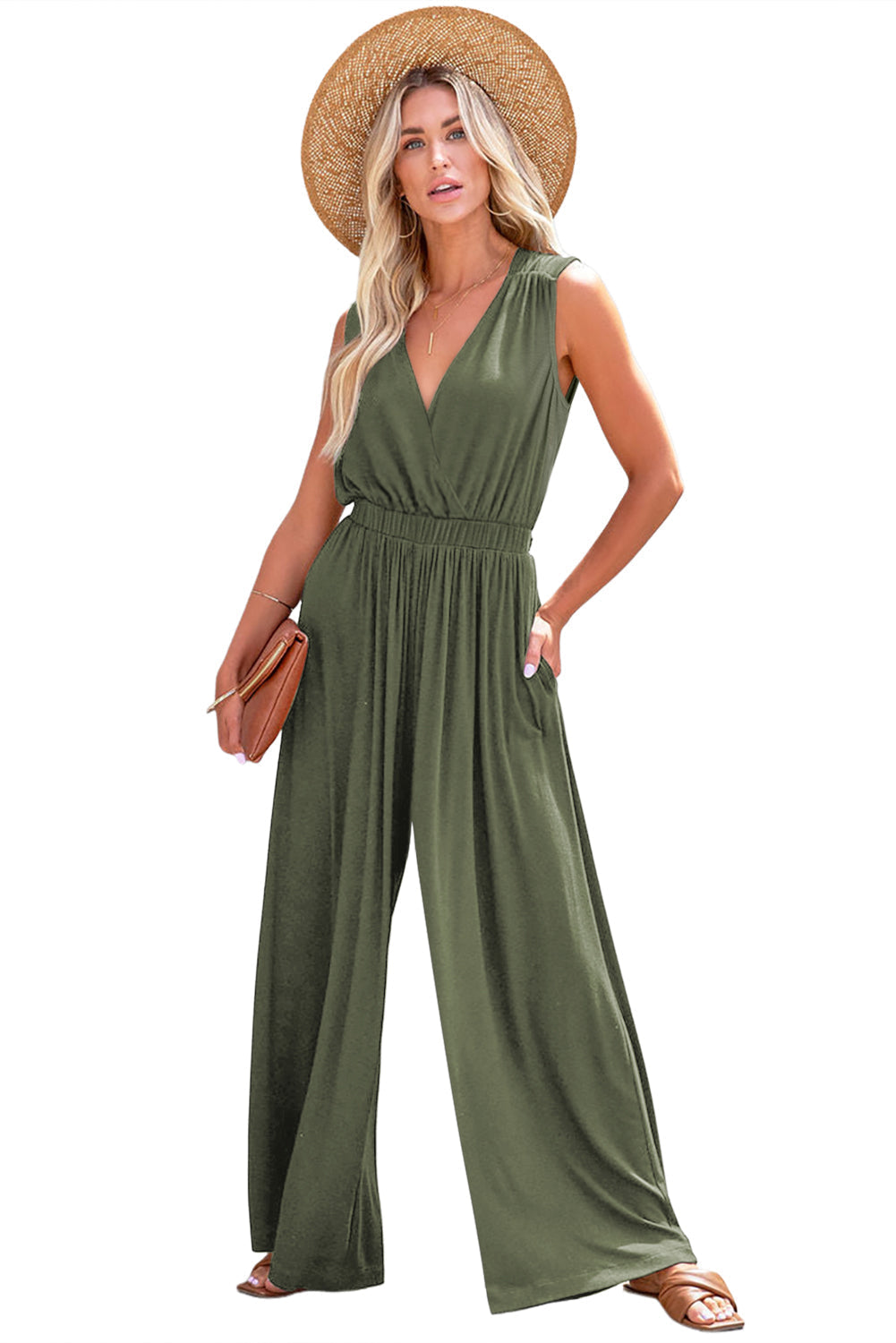 Combinaison élégante et flatteuse avec décolleté plongeant, design plissé pour la texture et le mouvement, dos nu croisé pour l'allure et jambe large amincissante - parfaite pour les fêtes, les rendez-vous et les vacances.