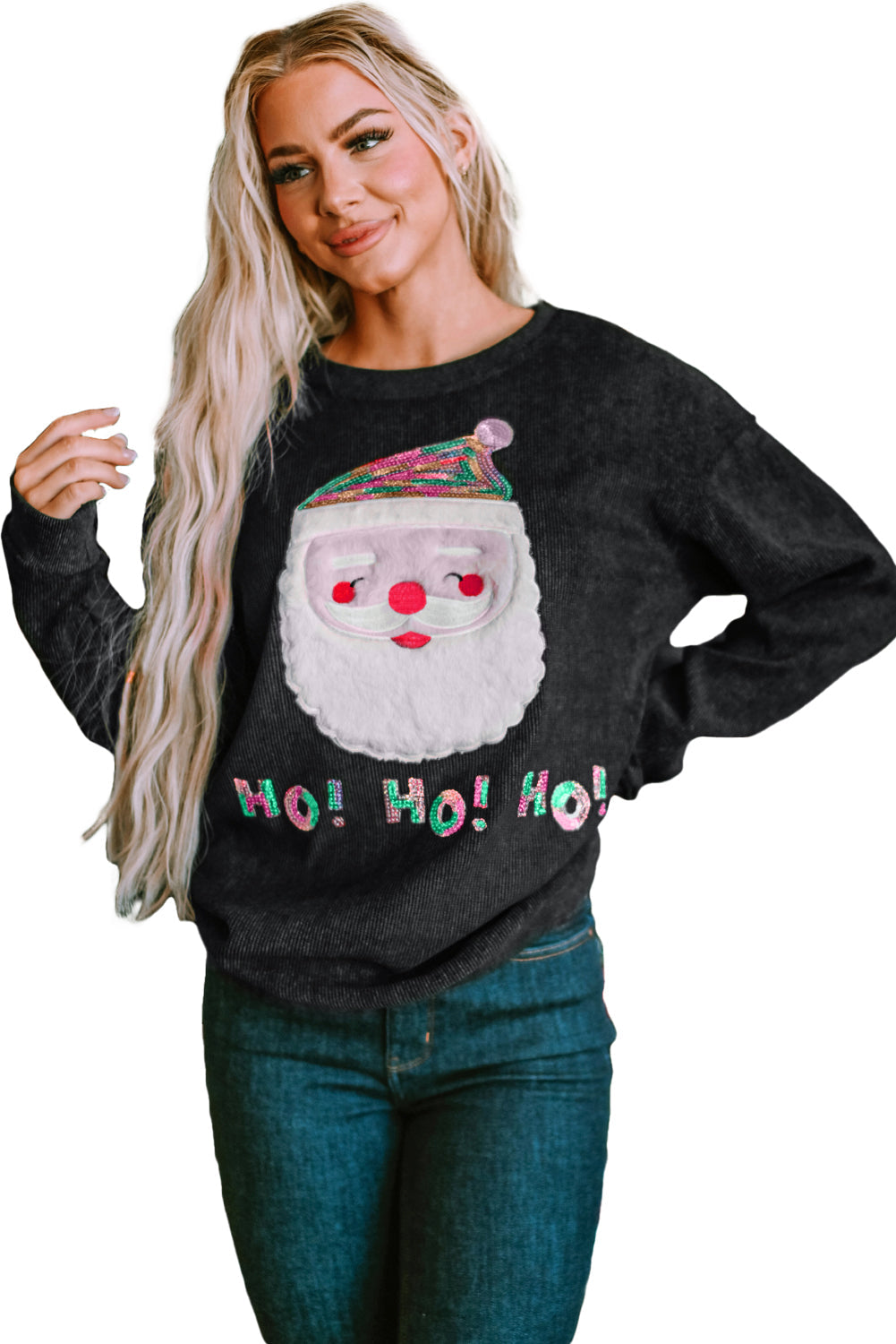 Les lettres à paillettes et le bonnet de Père Noël, associés à la texture côtelée, rehaussent la qualité de ce sweat-shirt. Adapté à toutes les morphologies, ce modèle polyvalent est un choix privilégié parmi les femmes modernes pendant la période de Noël. Les sweat-shirts graphiques sont très demandés, avec de solides chiffres de ventes constants.