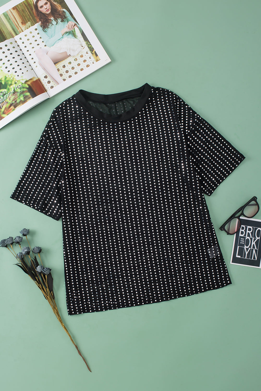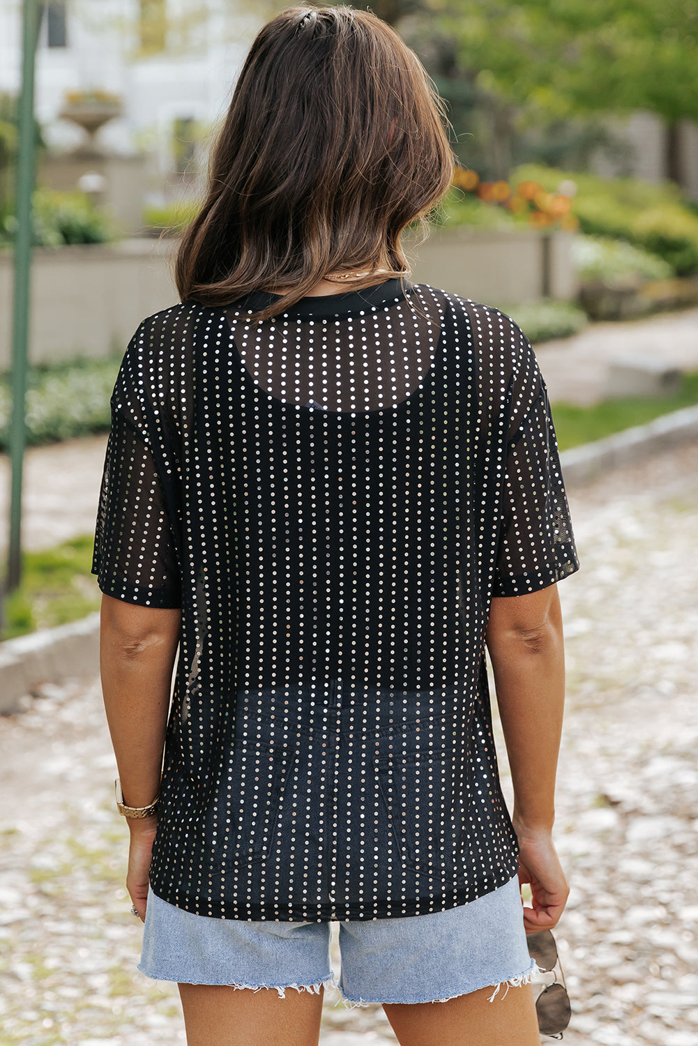 Rehaussez votre style avec le t-shirt transparent à paillettes et épaules tombantes. Cette pièce tendance présente des épaules tombantes et un tissu transparent pour un look à la fois décontracté et élégant. Sa silhouette flatteuse et son toucher cool en font un ajout polyvalent à n'importe quelle tenue, qu'il soit associé à un short en jean ou un jean.